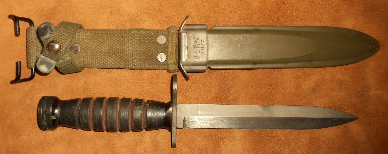 WW-2 made Imperial M4 M1 Carbine Bayonet in a later WW-2 made M8A1 sheath.