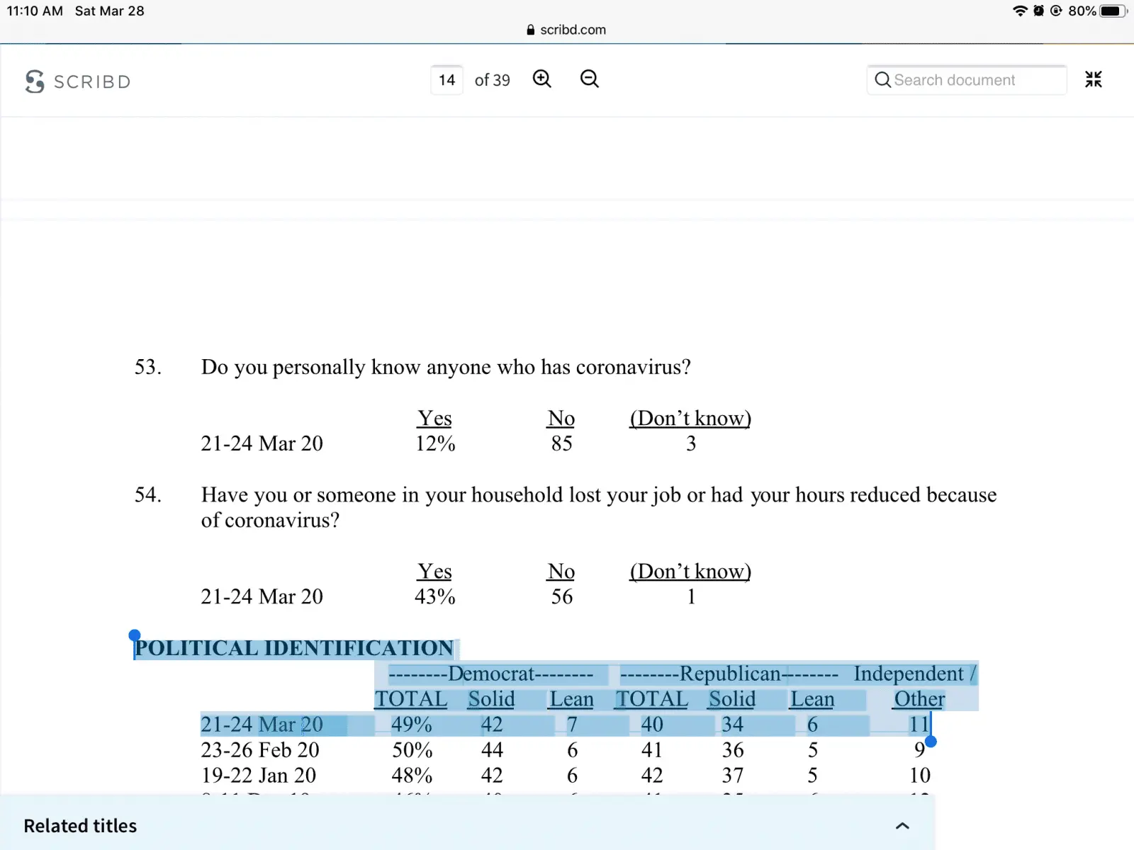 In the Mar. 26-27 survey, 50 percent of registered voters said they approved of the president's handling of COVID-19, compared to 56 percent saying the same in a Mar. 22-23 survey.