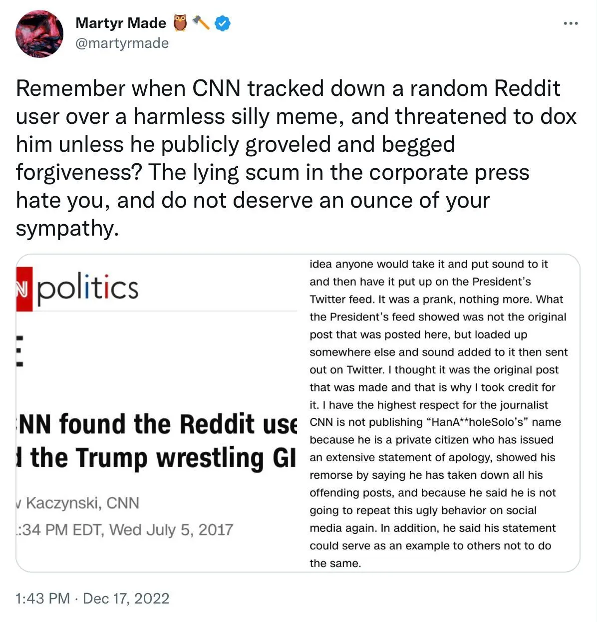 Needless to say, many conservatives are thrilled to see Taibbi lie, because their lives are dedicated to censorship. That's how fascists roll.