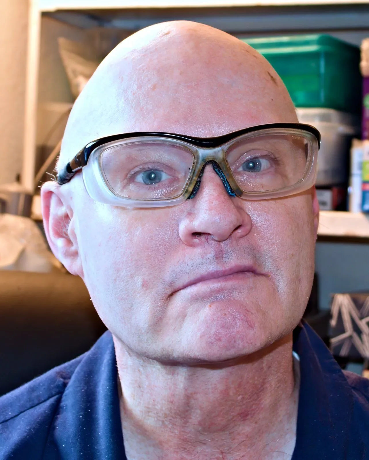 This picture taken less than an hour ago, to be posted elsewhere in connection with a comment that I don't think I look nearly as old as I am. It's possible, by now, that if I were to let my hair grow out, I might see that it is now grey or even white, and that might make me look older than I otherwise do. As of when I started keeping my head shaved, some time before about 2010 or so, it had not yet shown any signs of going grey.