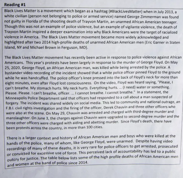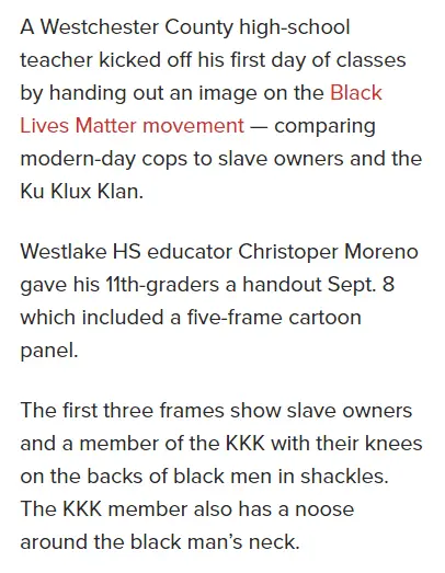 A Westchester County high-school teacher kicked off his first day of classes by handing out an image on the Black Lives Matter movement — comparing modern-day cops to slave owners and the Ku Klux K…