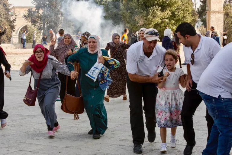 Palestinians seek safety from Israeli occupation forces firing tear gas and other weapons at worshippers in the al-Aqsa mosque compound in Jerusalemās Old City, 27 July.