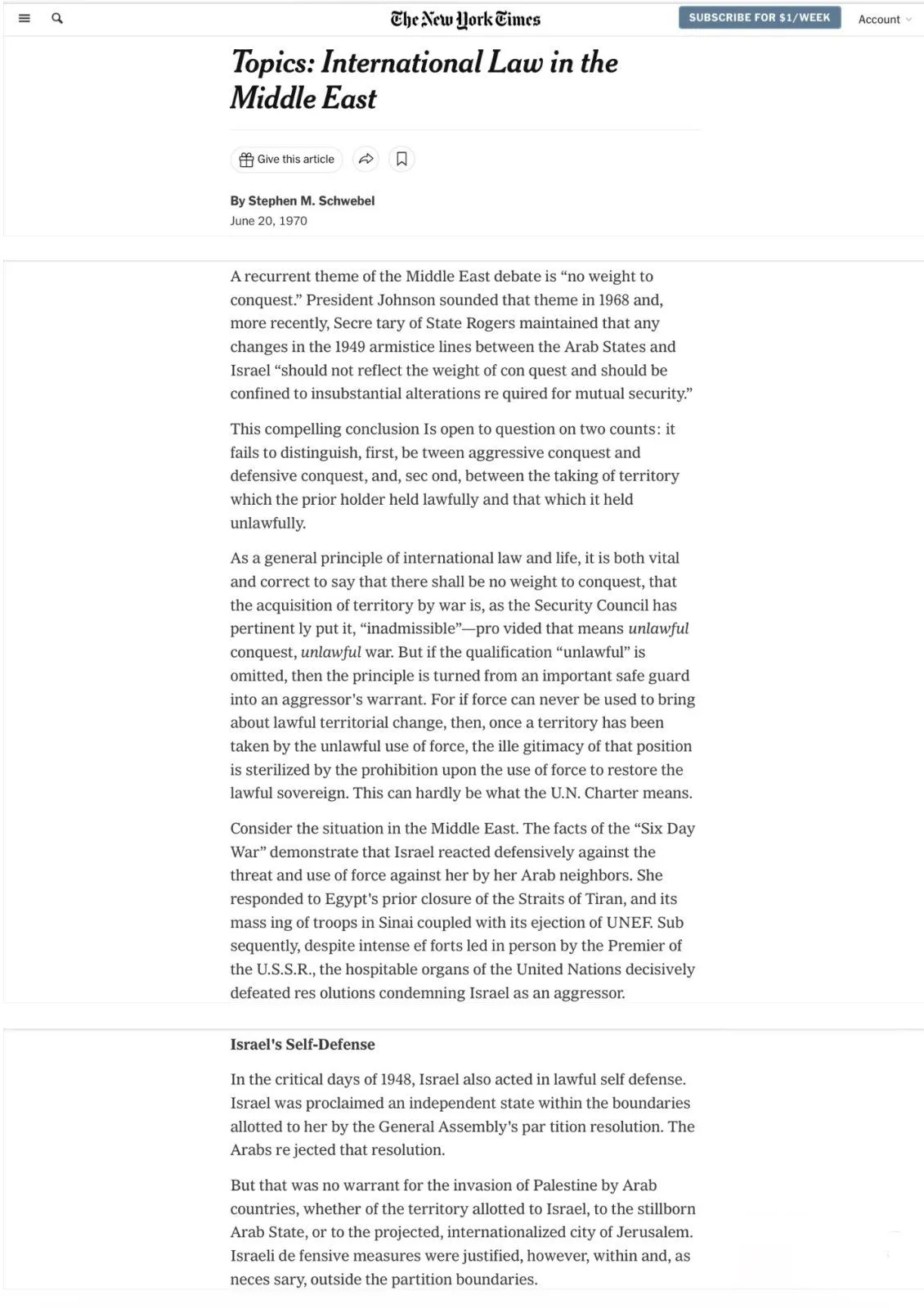 “A recurrent theme of the Middle East debate is “no weight to conquest.” President Johnson sounded that theme in 1968 and, more recently, Secretary of State Rogers maintained that any changes in the 1949 armistice lines between the Arab States and Israel “should not reflect the weight of conquest and should be confined to insubstantial alterations required for mutual security.