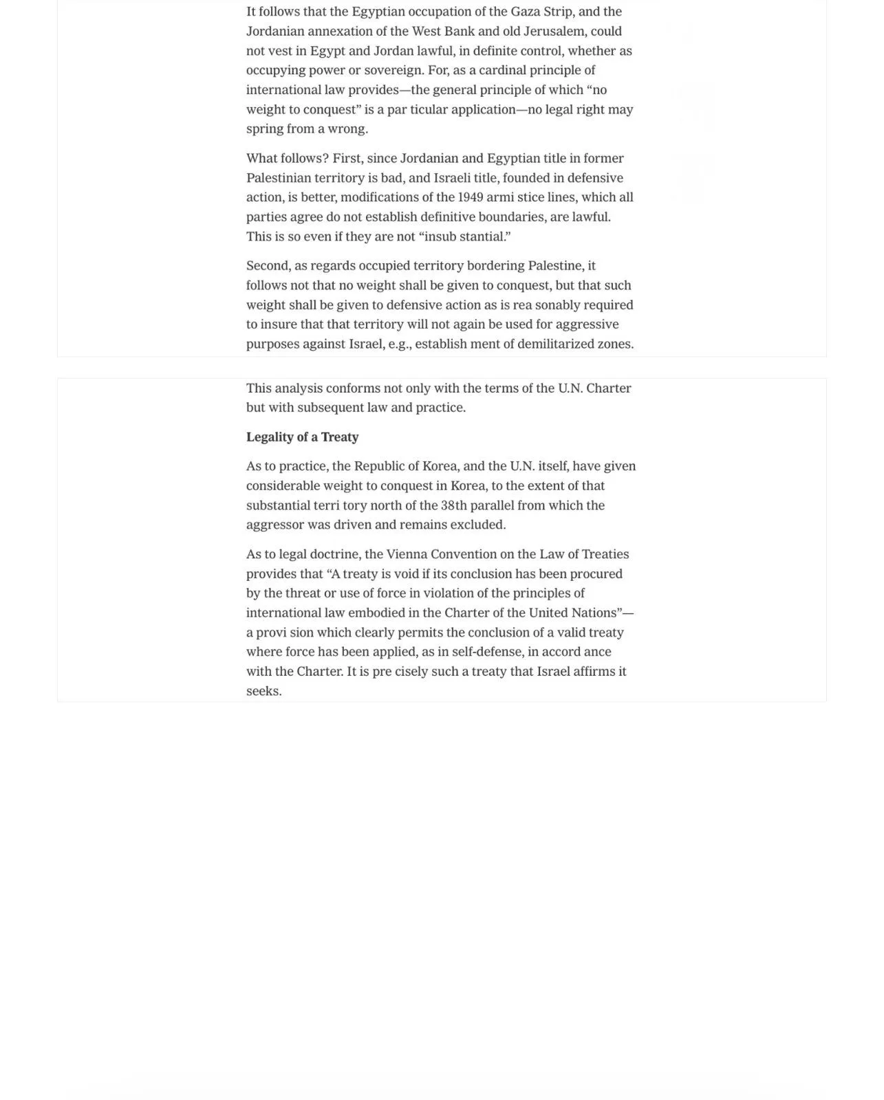 As to legal doctrine, the Vienna Convention on the Law of Treaties provides that “A treaty is void if its conclusion has been procured by the threat or use of force in violation of the principles of international law embodied in the Charter of the United Nations”—a provi sion which clearly permits the conclusion of a valid treaty where force has been applied, as in self‐defense, in accord ance with the Charter. It is pre cisely such a treaty that Israel affirms it seeks.”