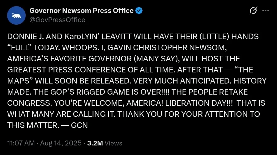 “DONALD TRUMP, THE LOWEST POLLING PRESIDENT IN RECENT HISTORY, THIS IS YOUR SECOND-TO-LAST WARNING!!! (THE NEXT ONE IS THE LAST ONE!),” Newsom’s press office posted on the social platform X. “STAND DOWN NOW OR CALIFORNIA WILL COUNTER-STRIKE (LEGALLY!) TO DESTROY YOUR ILLEGAL CROOKED MAPS IN RED STATES.”