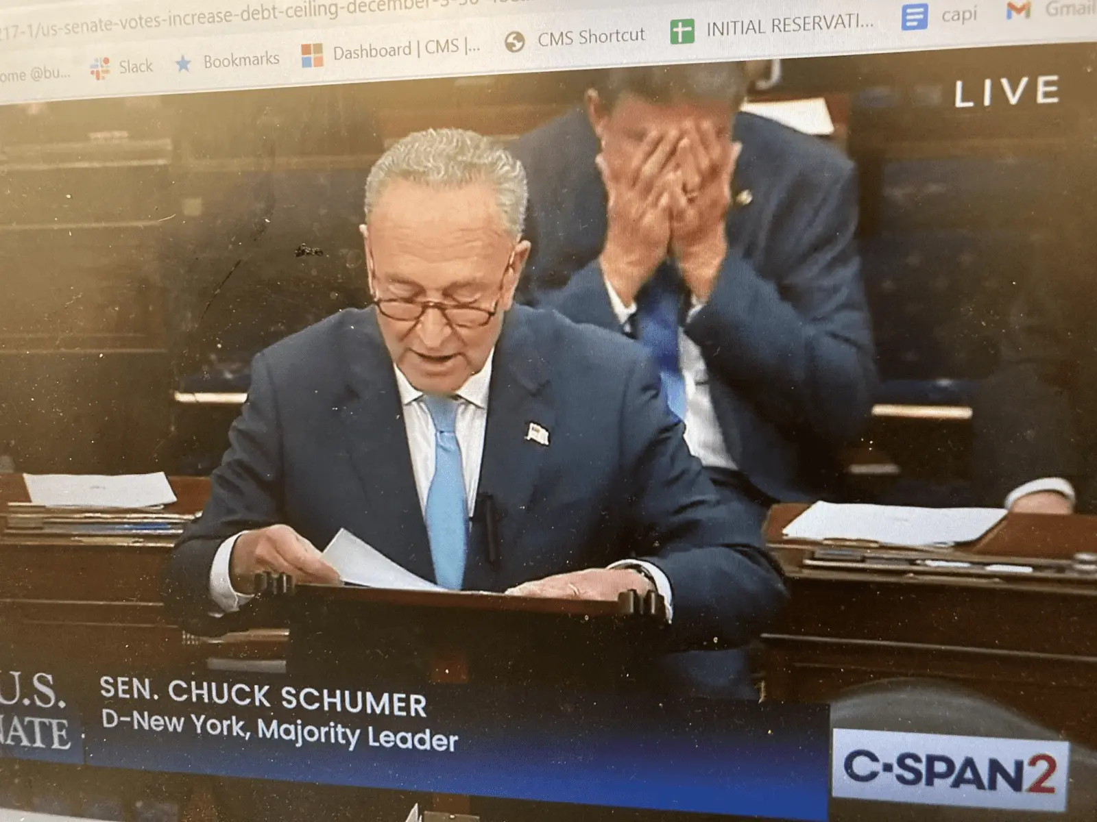 That is Joe Manchin behind Schumer's left shoulder burying his face in his hands. Even he knows what a disaster this has become.