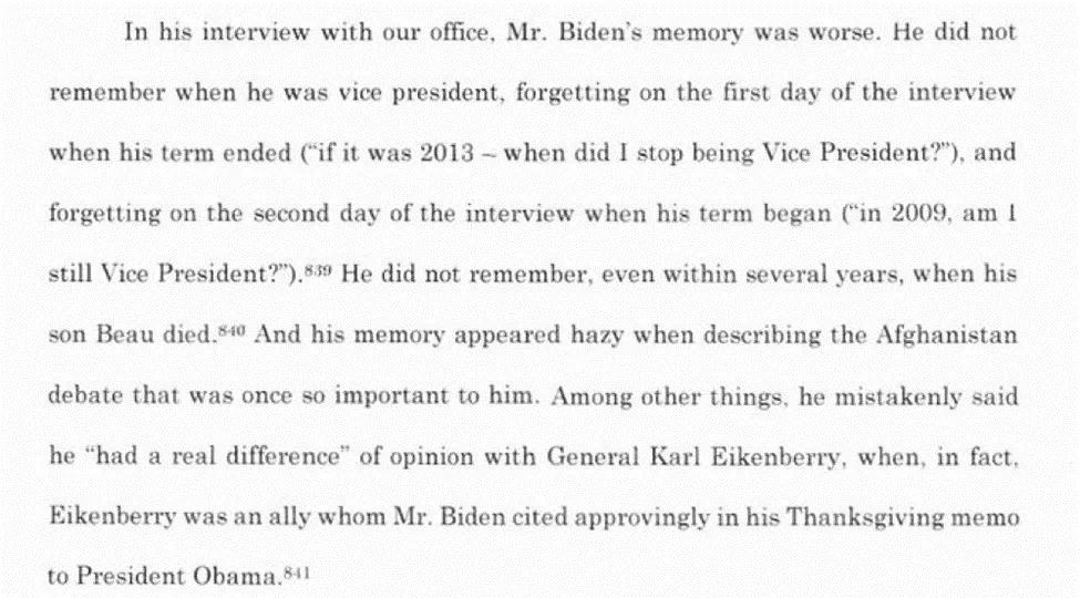 The report points out the big difference between Biden and trump. trump refused to return the documents, lied, destroyed evidence. Biden immediately turned over the documents and voluntarily allowed searches at other locations.