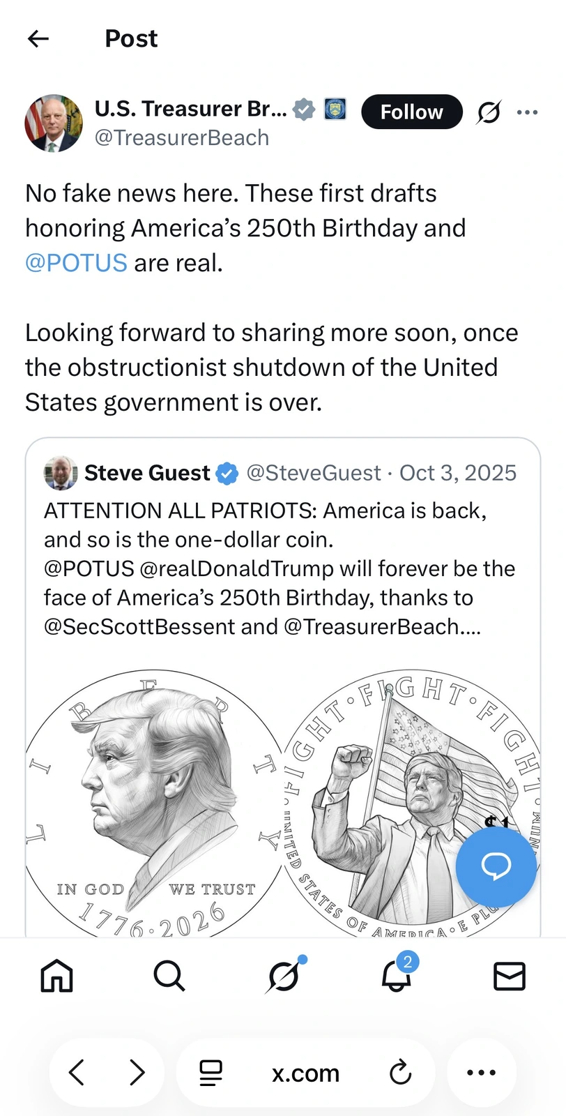 The treasurer himself has posted that they’re minting a Trump coin on twitterDid you see this in a Faux Noise report, or did you see it at the official US Treasury site?