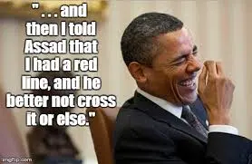 Of course after Al-Assad called him on his ill-advised 'Red Line' bluff, forcing Barry to cowardly back down, Barry tried to claim that it was NOT HIS 'Red Line' but the WORLD'S 'Red Line'....