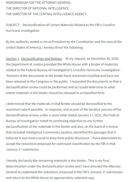 The materials in the binder spoken of in this memorandum from President Trump to the Attorney General are declassified by law, and even in writing though that was not required.