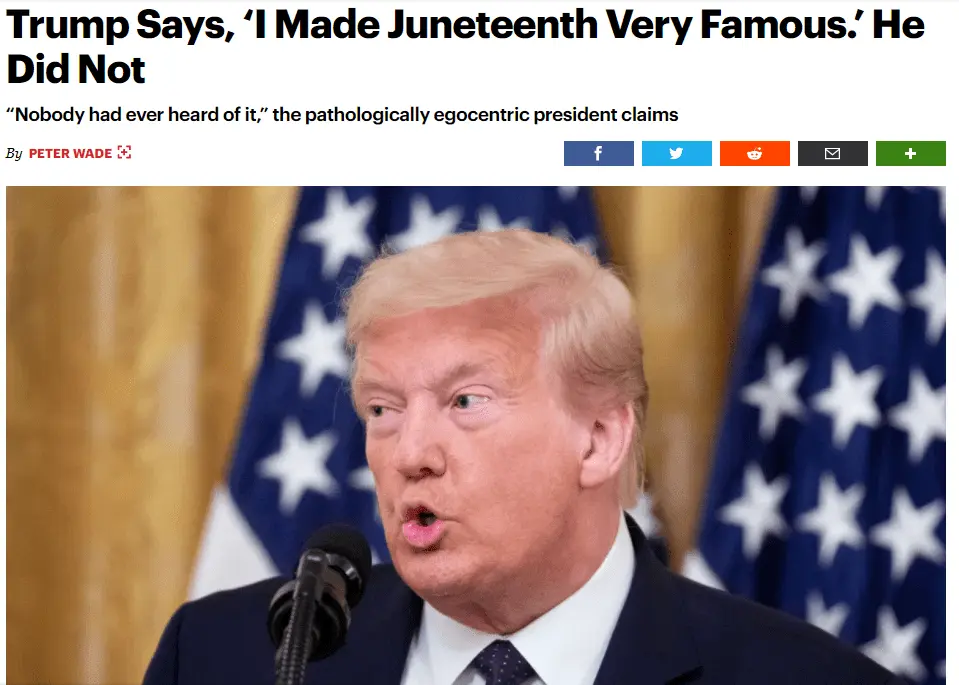 June 19 is the anniversary of the death of Len Bias. No one ever mentioned anything else about that date for the past 34 years.Our president actually said that. If there was any doubt about how little knowledge or concern he has for the black community, that one remark is enough to illustrate how much concern he has. I doubt his remark will hurt him though, because there couldn't be more than a few dozen black voters supporting him anyay. Seeing that Juneteenth is a state holiday in 48 states, and the White House released remarks commemorating it for the last three years, is there anyone who didn't know about Juneteenth before Trump came along?