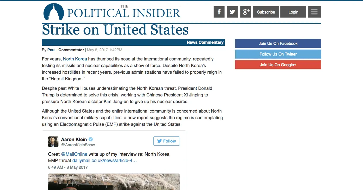 Although the United States and the entire international community is concerned about North Korea’s conventional military capabilities, a new report suggests the regime is contemplating using an Electromagnetic Pulse (EMP) strike against the United States.