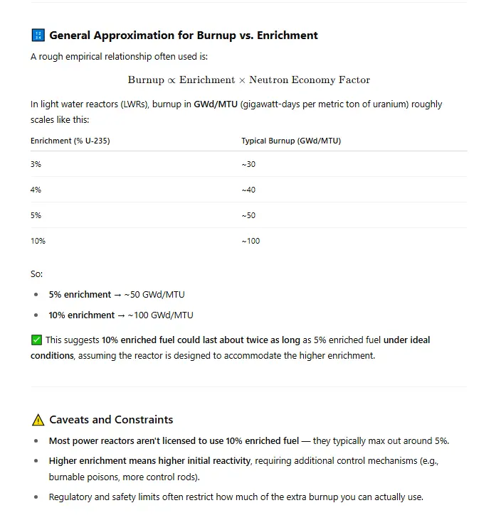 If you have low enrichment, then the whole process produces less heat per gram, so then you need far more fuel mass, which then means much larger containment dome.