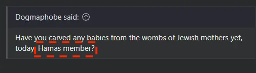 I certainly would not address forum usership as ''Hamas member'' and infer that they cut babies out of wombs, by asking them how many they have cut out today, just because I didn't like their post about goings on.