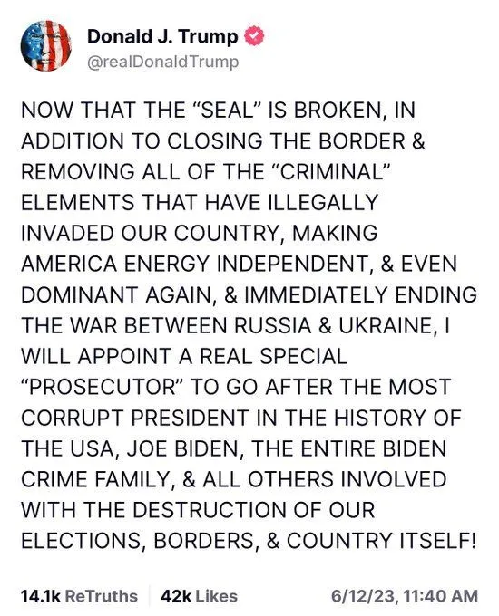 Trump tweeted "Now that the seal is broken..." earlier today in reference to the unprecedented indictment of a former president. What the Biden administration has done is an unprecedented historical event that will have a major impact on our world. They have literally opened a "Pandora's Box", laying ground for the unthinkable.