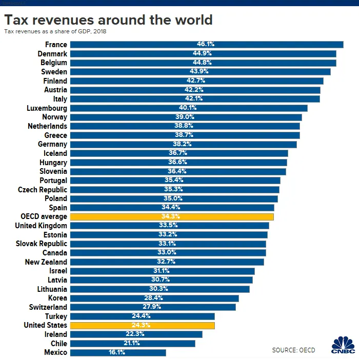 From 2017 to 2018, the U.S. tax-to-GDP ratio fell from 26.8% to 24.3%, the OECD found, while corporate tax revenues fell by .7% and personal income tax revenues dropped by .5%.