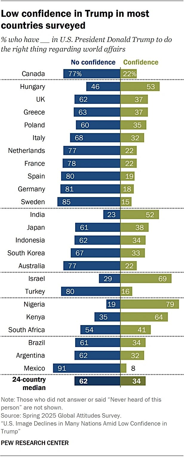 Majorities in most countries also express little or no confidence in Trump’s ability to handle specific issues, including immigration, the Russia-Ukraine war, U.S.-China relations, global economic problems, conflicts between Israel and its neighbors, and climate change.
