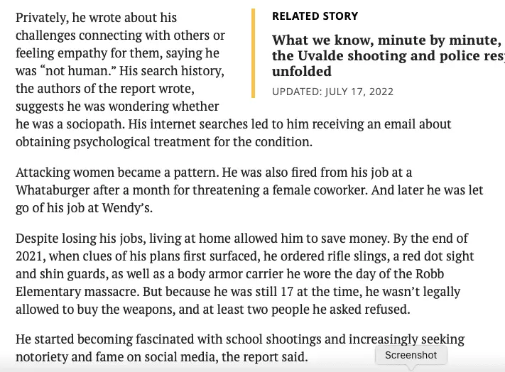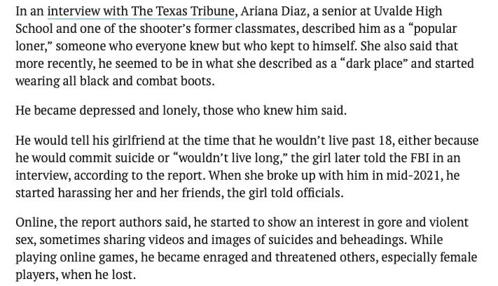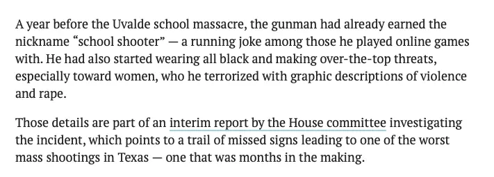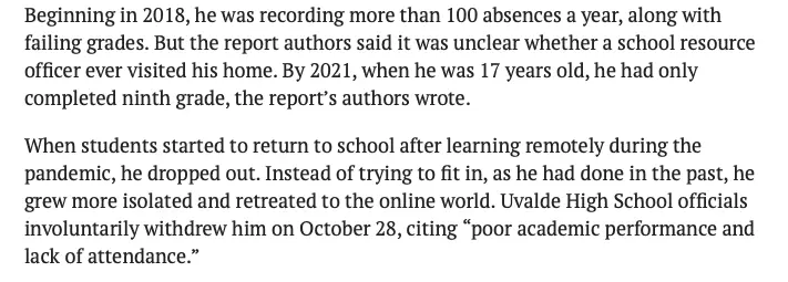 The Monster of Uvalde was an animal torturer and mutilator; he carried around bags of decapitated cats. Sickos like him have a preoccupation with heads and faces and fixate on negating / obliterating facial features. From early childhood people like him create drawings of people and animals that feature headless bodies or faceless heads . . . Was anyone paying attention?