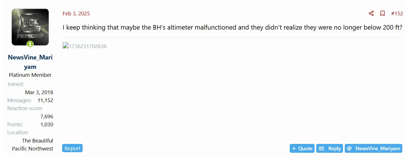 The impression I received from everything I was hearing & reading was that this was completely unexpected by both flight crews as well as air traffic control meaning this wasn't just a screwup. I had a sense that the Black Hawk pilot, for whatever reason, didn't realize that where she was, was way beyond the 200 foot ceiling restriction for helicopters in that area. This is what caused me to wonder if perhaps she was getting an erroneous reading from her altimeter.