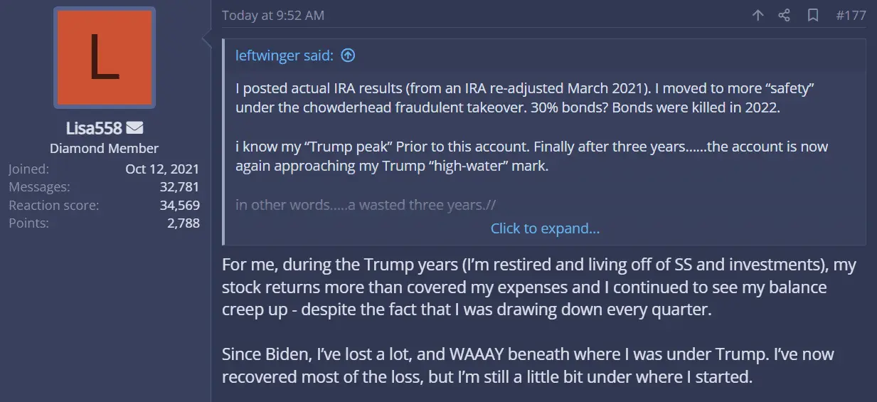 What are you babbling about?I posted actual IRA results (from an IRA re-adjusted March 2021). I moved to more “safety” under the chowderhead fraudulent takeover. 30% bonds? Bonds were killed in 2022.