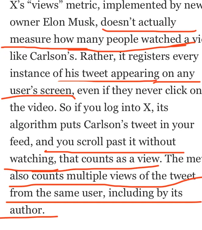 “X’s “views” metric, implemented by new owner Elon Musk, doesn’t actually measure how many people watched a video like Carlson’s. Rather, it registers every instance of his tweet appearing on any user’s screen, even if they never click on the video. So if you log into X, its algorithm puts Carlson’s tweet in your feed, and you scroll past it without watching, that counts as a view. The metric also counts multiple views of the tweet from the same user, including by its author.”