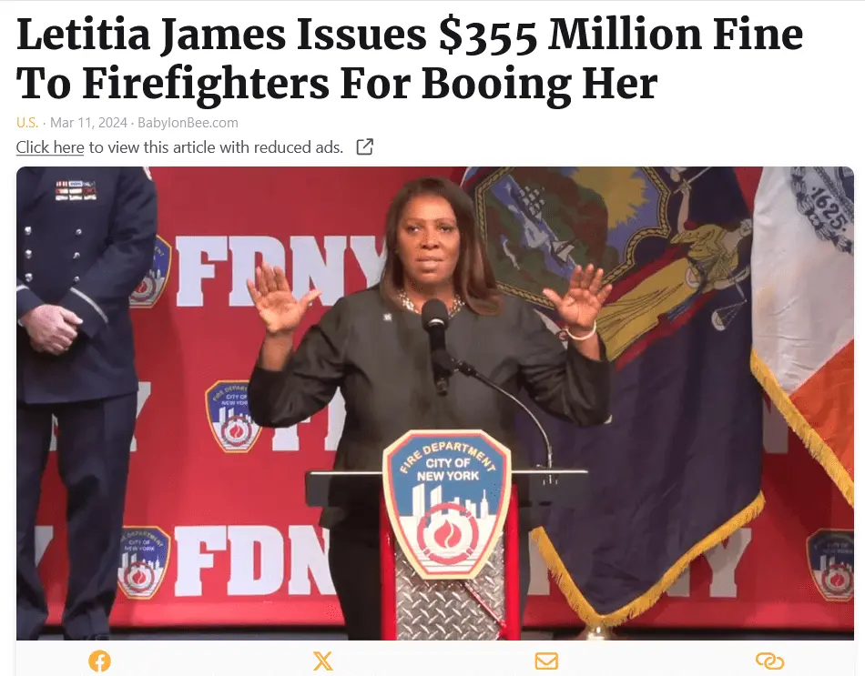 NEW YORK, NY — After being viciously booed at an FDNY promotion ceremony last week, New York AG Letitia James has announced she will be issuing $355 million-dollar fines to the perpetrators.babylonbee.com