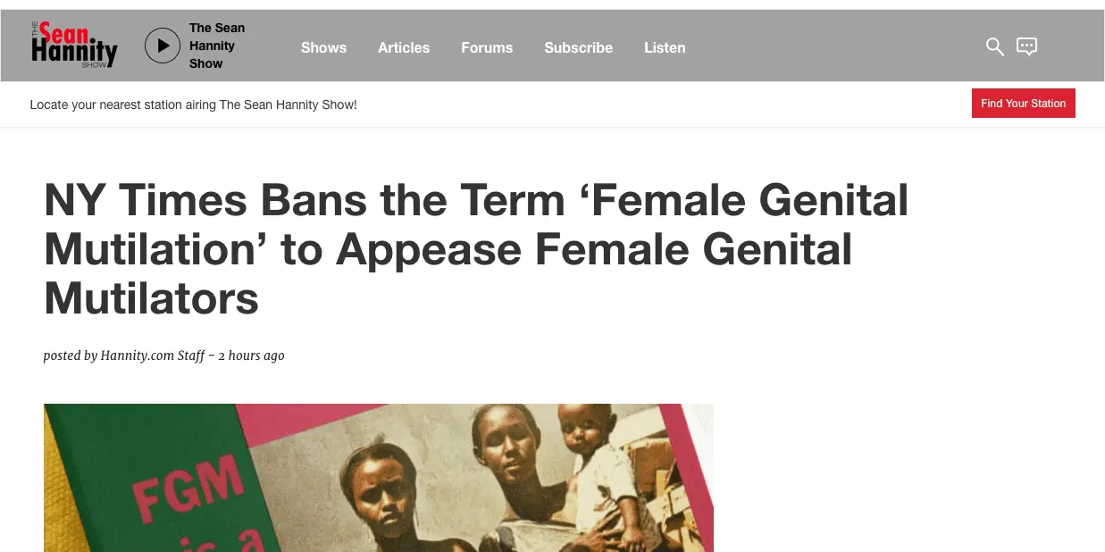 The FGM culture is hard right and uber conservative. No liberal or conservative supports it.It's not surprising that liberals are in favor of a female genital mutilation. So why wouldn't the New York Times ban the term?View attachment 123155Fox News.