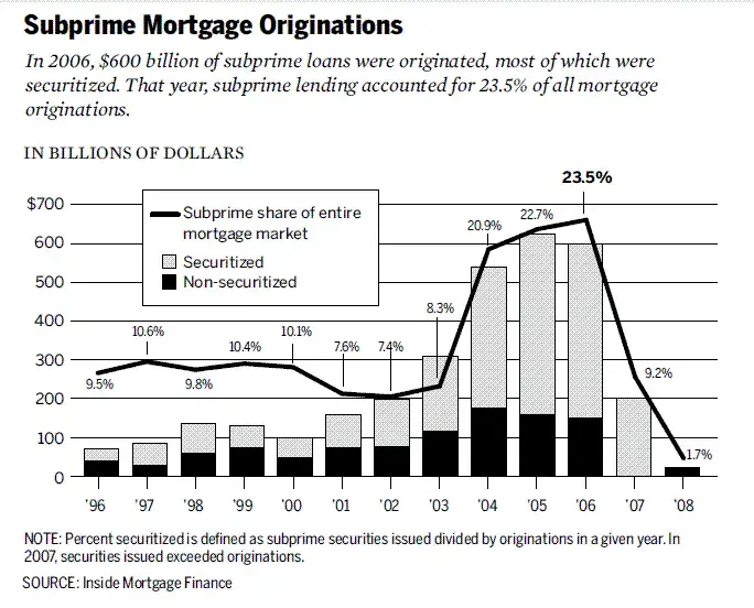 Rapid Growth and Risk: Private-label securitization, which funded most subprime mortgages, exploded from 2001 to 2007, often eclipsing traditional government-sponsored enterprises (GSEs) like Fannie Mae and Freddie Mac.