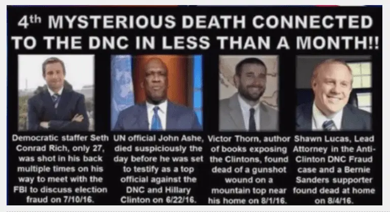 Also in just ONE MONTH there were FOUR convenient and mysterious deaths connected to the DNC and all were potential problems for specifically Hillary Clinton, again if the below were connected to Donald Trump you would be saying he had them all murdered to silence them: