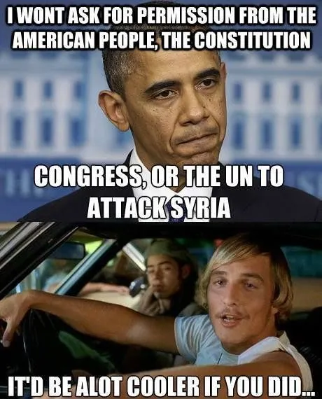 I have said from the git go, obama can do what he wants to for, 60 days.....he knows it. he said so, this going to congress thing is, well, nonsensical now. So if they say yes, ..so? he could have done this a year ago, 6 months ago, 3 months ago after the first attack, or 2 weeks ago....now? and of they say no, we will see umpteen you-tube playbacks of bidens threats ala Bush not seeking permission etc. How will that look?