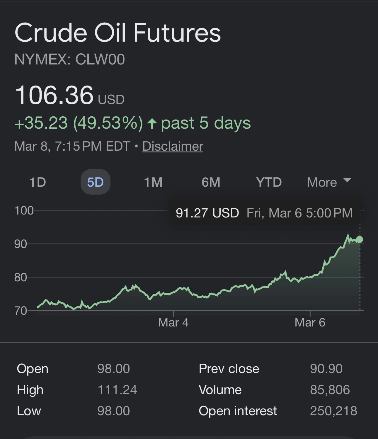 After adding more than $40 a barrel in a little more than five trading sessions, the nominal record for West Texas Intermediate futures—$145.29, set on July 3, 2008—no longer seems out of reach. And if the Strait of Hormuz remains a barrier to Middle Eastern barrels reaching the market for long, an inflation-adjusted all-time high around $215 a barrel might also be in sight.
