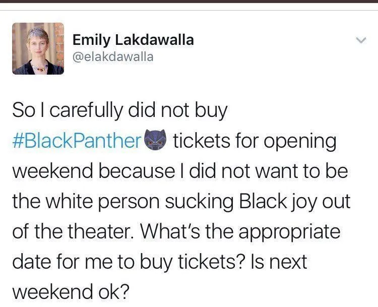 I wanted to go see it cuz I thought it was a black panther movie sjw type stuff and street crime....on the other end of the pendulum. I've been hearing that some of you are saying to hold off on seeing Black Panther because it will somehow invade the space of Blacks. I'm here to tell you as a Black person we dont get down like that. If you want to see it...go see it. We dont care.