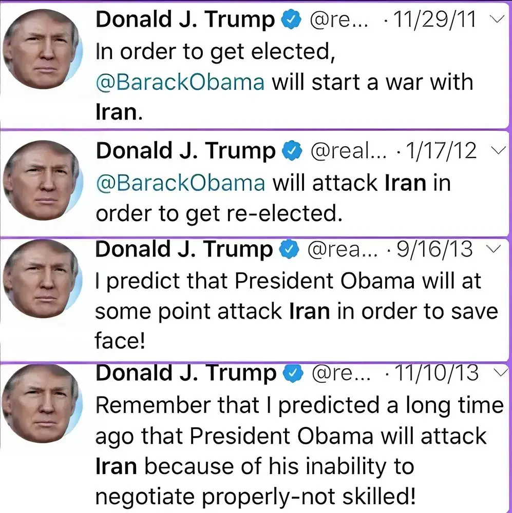 As the president continued to ramp up his rhetoric against Iran, critics pointed to a November 2013 social media post where Trump accused then-President Barack Obama of planning to attack Iran.