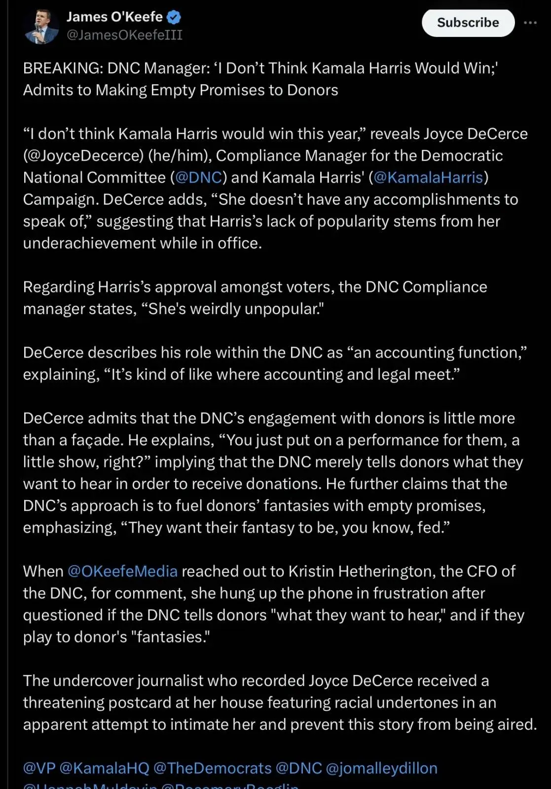 “You just put on a performance for them, a little show, right?” implying that the DNC merely tells donors what they want to hear in order to receive donations. He further claims that the DNC’s approach is to fuel donors’ fantasies with empty promises, emphasizing, “They want their fantasy to be, you know, fed“