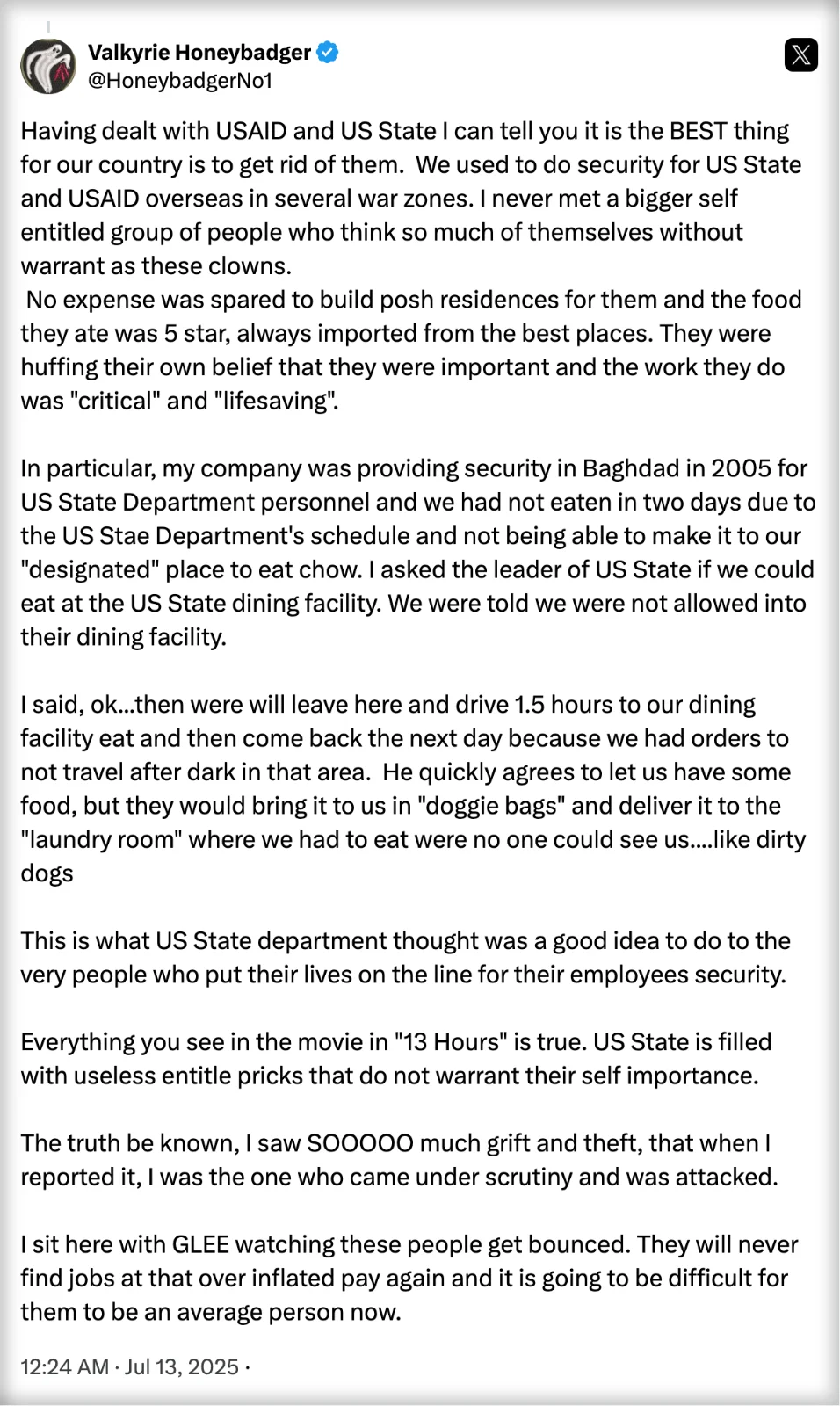 It's pretty much like that with all Government employees. In my section in Korea we had two civilians, a Major and me. The Officer was a short timer and seldom ever in the office so I did most of his job. One of the civilians was a contractor and pretty cool the other was a GS-8 and a total dick. At one point I got tired of his shit a told him that I didn't work for him he worked for me. Straightened his ass out quick.Odd you mention 13 Hours in Benghazi.
