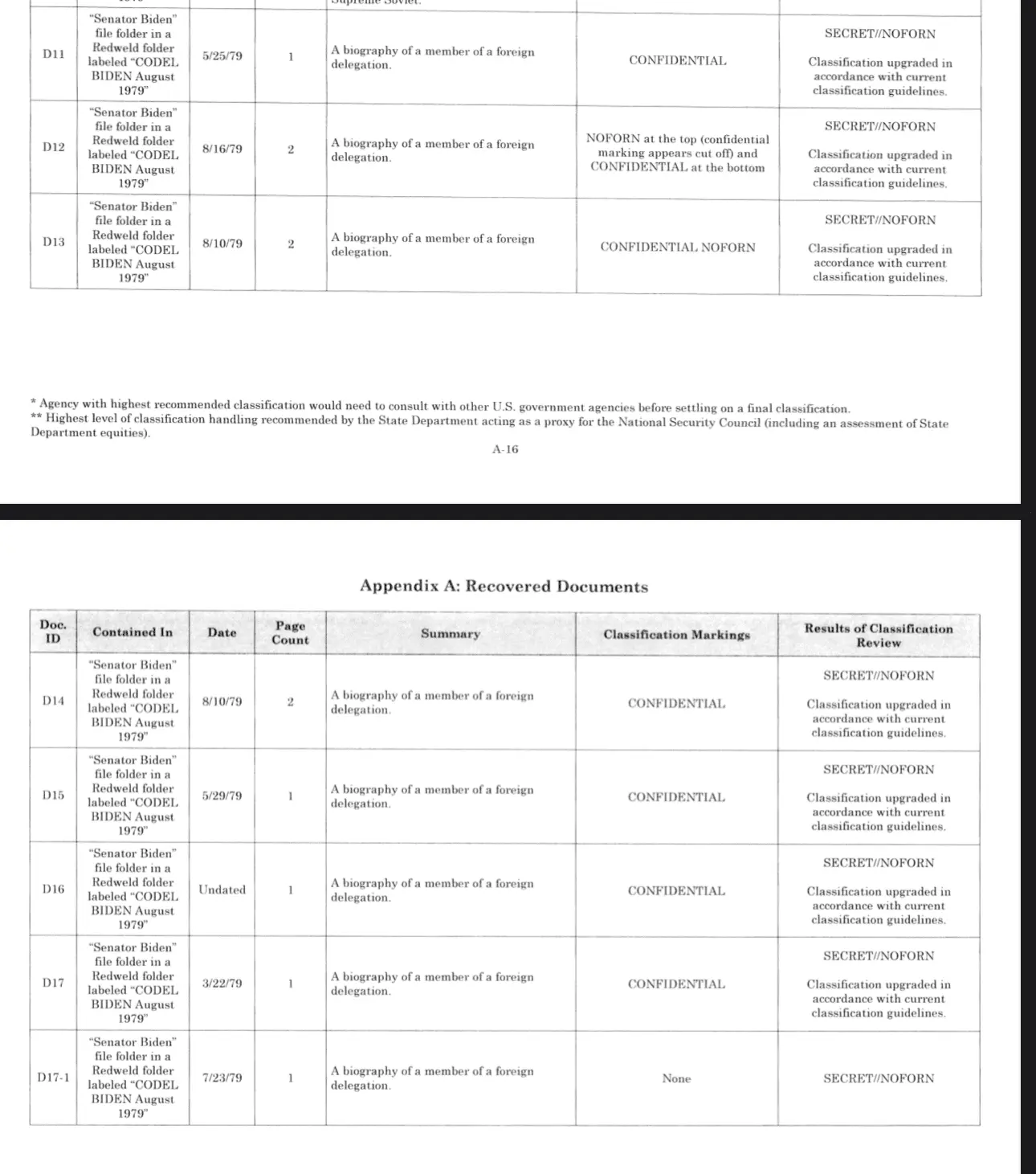 Indeed. Basically all of those were biographies on foreign dignitaries. Look through appendix A. Specifically on A-16.A dozen documents classified as "Secret" from his Senate days were discovered. Page 175 of the Hur report.