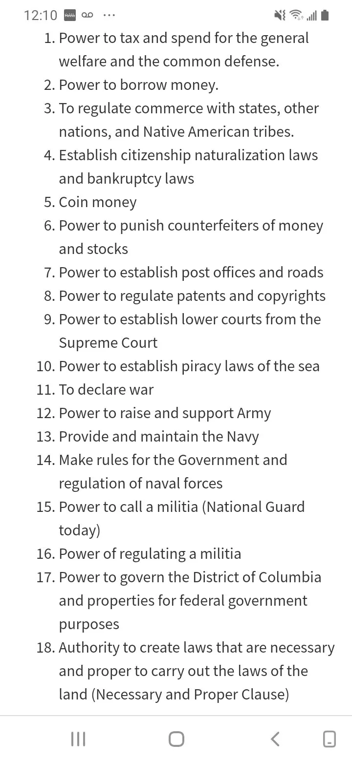 I looked it up and FINALLY FOUND where you and fellow Liberals are getting all this general welfare business. It is actually listed in one of the 18 enumerated powers; however so are all the other listed powers referring to military and defense, that take up many more articles in the same list (11, 12, 13, 14, 15, and 16, while sharing the number 1 spot with BOTH common defense and general welfare stated together). The ratio is strongly toward govt having more business and responsibility for armed and common defense. Clearly individuals cannot represent that for the whole nation, so it makes sense Federal Govt should manage national security and defense for the US as a whole body, while the OPPOSITE is true with individual health care and educational and social policies, that individuals need to defend their own choices which cannot be "dictated the same for everyone by federal govt" (unless we each and all agree to the same policies, which clearly we do not due to cultural and religious differences Govt can defend but cannot establish, prohibit, regulate or penalize for Constitutional reasons). See below, and count how many of the 18 powers refer to military and common defense duties of govt. Very interesting and enlightening, danielpalos , thank you for pointing out both sides are in there but the ratio is clearly on the side of govt focused on external issues of security and not on micromanaging internal affairs which runs afoul by depriving individuals of liberty without due process and by not seeking the least restrictive means of meeting compelling govt duty to protect and represent public interests, including all people of all creeds, not just onesided partisan narrative or solutions seeking to define policy for everyone without taking diversity into account.View attachment 470149