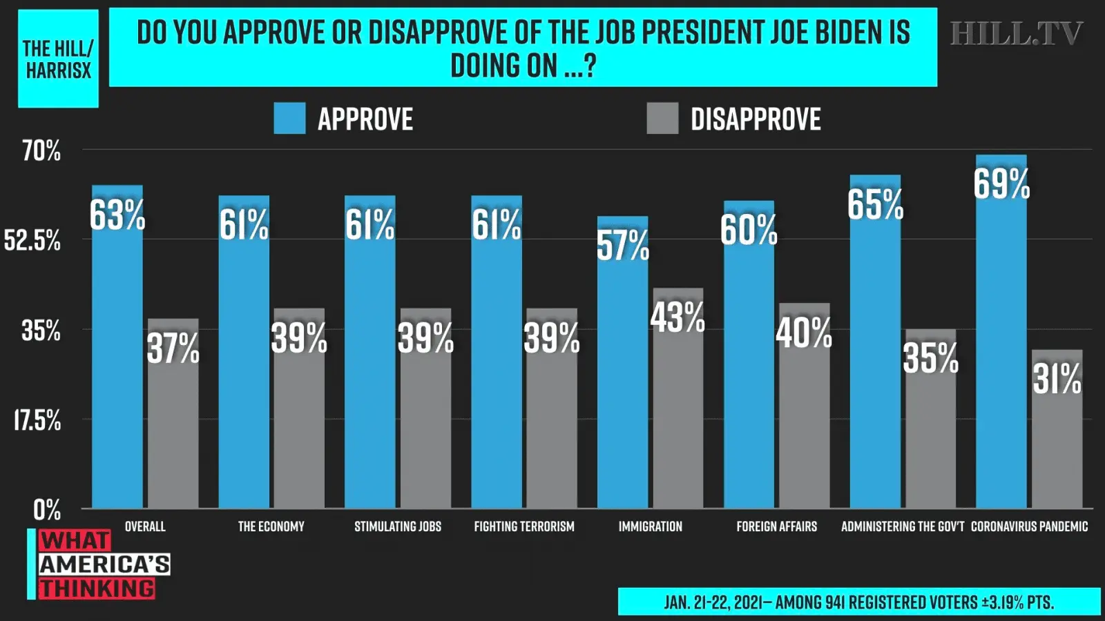 The Hill-HarrisX poll’s first presidential job approval rating for Joe Biden comes in at 63 percent support among registered voters.Only 37 percent of respondents in the Jan. 21-22 surve…thehill.com