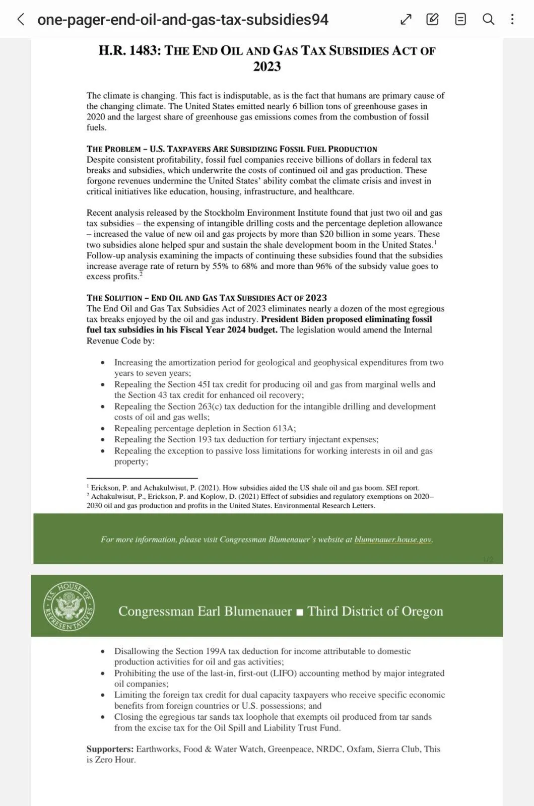 "Today I introduced the End Oil and Gas Tax Subsidies Act of 2023. This legislation eliminates nearly a dozen of the most egregious tax breaks enjoyed by the oil and gas industry.President Biden proposed a similar initiative in his Fiscal Year 2024 budget.