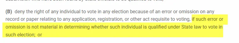It specifically says (I paraphrase) that voters cannot be denied the right to vote on a minor error or omission that is not materials to the vote.