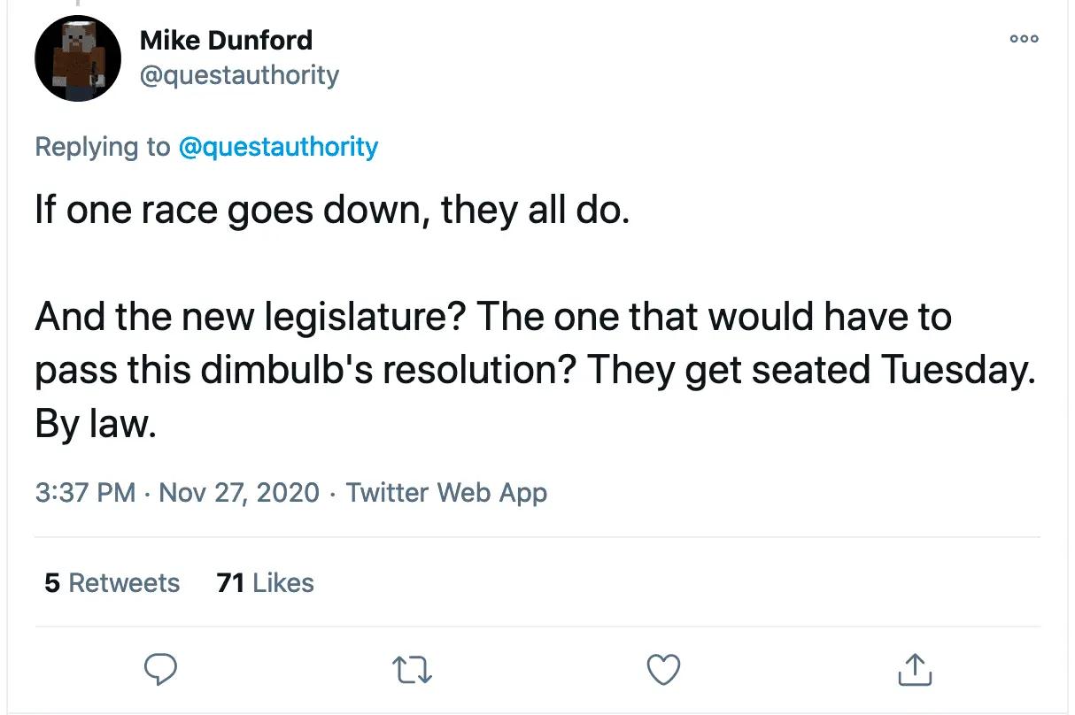 If the date is December 1st and they can't certify elections after that.....Then the new republcians will? I guess once the non federal votes are sorted out.