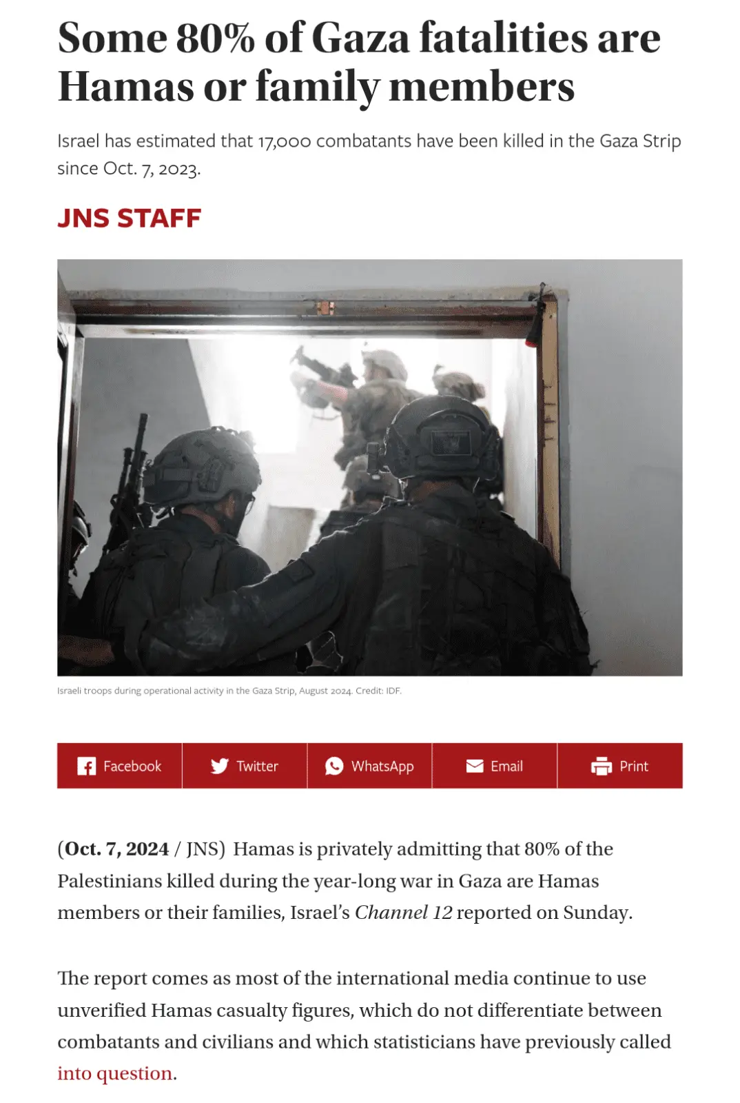 The report comes as most of the international media continue to use unverified Hamas casualty figures, which do not differentiate between combatants and civilians and which statisticians have previously called into question.