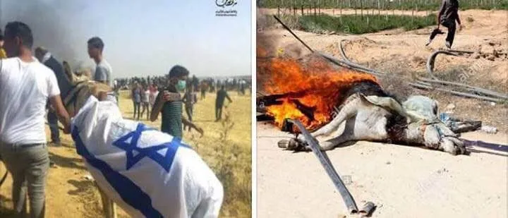 The image of the donkey that was burned is from 2014, here: Palestinians burn the donkey, who was killed earlier by an Israeli...