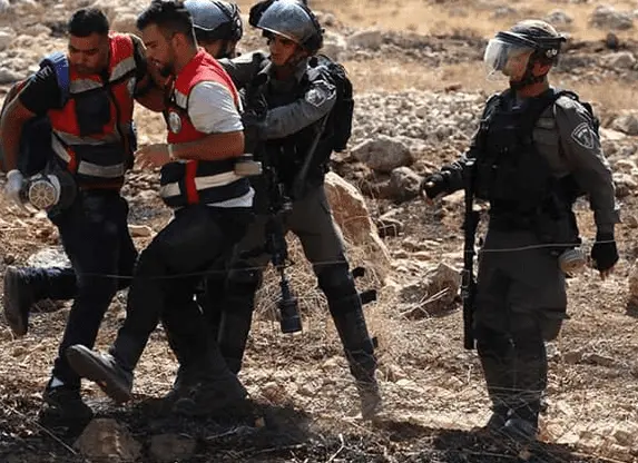 Israeli soldiers assault Palestinian medics during a West Bank protest against the settlement.