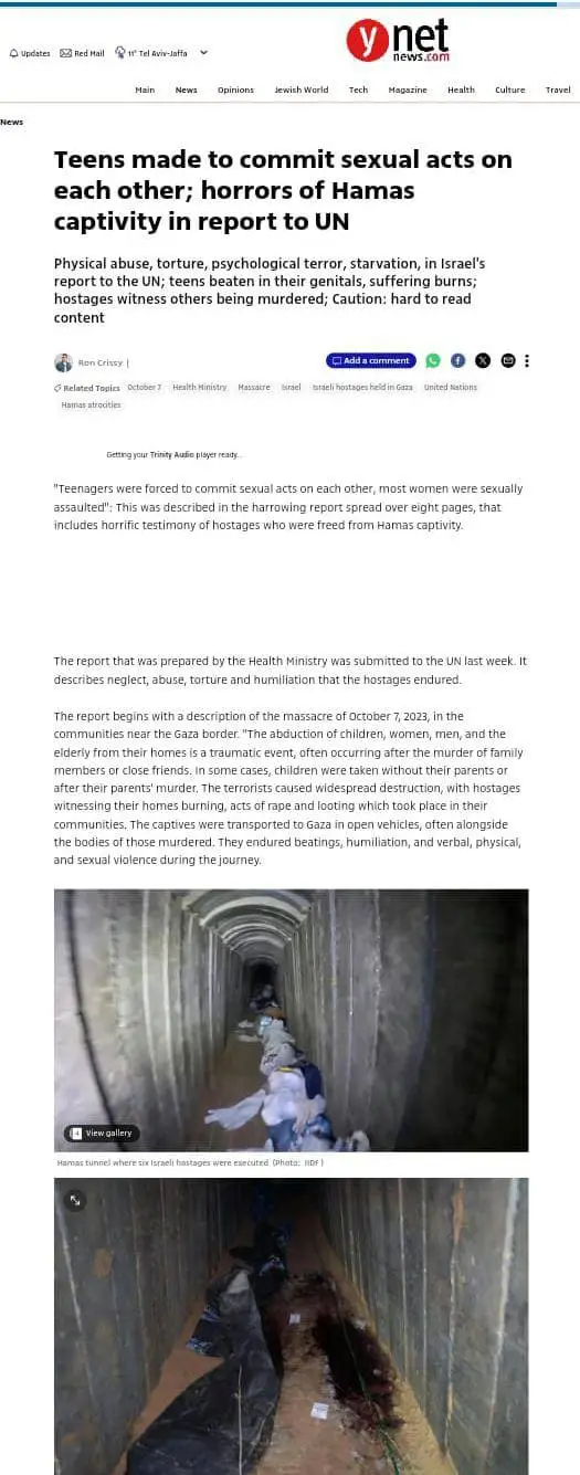 Physical abuse, torture, psychological terror, starvation, in Israel's report to the UN; teens beaten in their genitals, suffering burns; hostages witness others being murdered; Caution: hard to read content