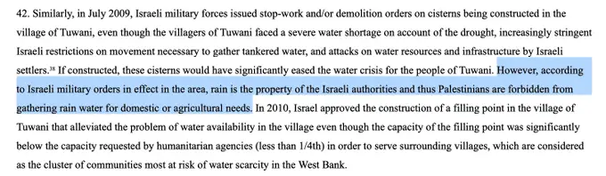 Source: a UN report: 'according to Israeli military orders in effect in the area, rain is the property of the Israeli authorities and thus Palestinians are forbidden from gathering rain water for domestic or agricultural needs.'
