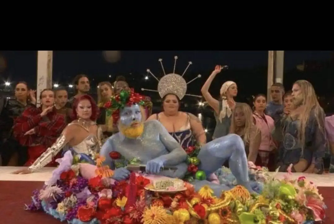 Sorry, but you are. It was a Bacchanalia. Thus the halo (not found in last supper painting, but found in paintings of the bacchanalia). Thus the higher number of people. Thus the flashy outfits and extravagant spread.no i'm not.. i know creep when i see it... good try.