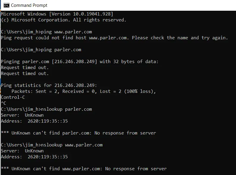It's interesting that the link in my OP still shows DNS lookup failures for parler.com all over the world.
