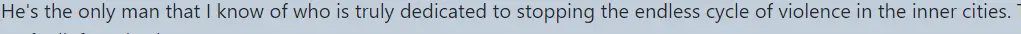 He's the only man that I know of who is truly dedicated to stopping the endless cycle of violence in the inner cities. There is a lot of talk from both Parties but nothing ever changes.