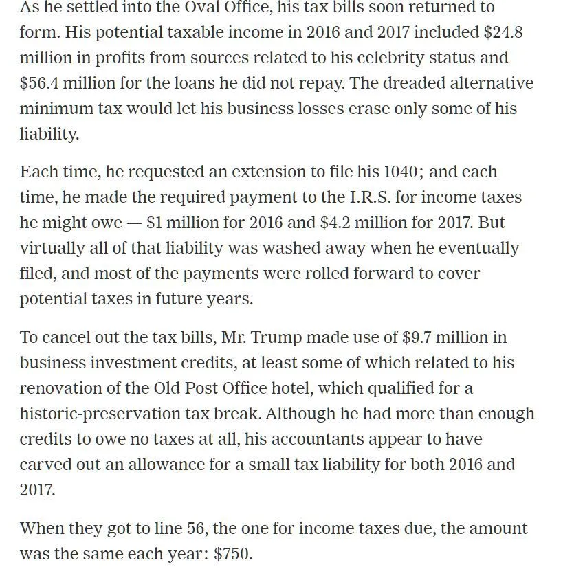 That is different of course, when Biden does it no problem at all. But if Trump does ohh hell the world is collapsing.Name one thing Trump has done to reduce his tax liability that wealthy Democrats have not also done.You Trumptards can try and spin this all you want it still doesn't erase the fact that working stiffs all over this country, working paycheck to paycheck to pay their mortage or rent pay more taxes that Trump. They can't afford tax attorneys in shark skin suits finding ways for him to dodge his taxes. 'Ways' that have him under investigation for fraud..like over valuing his properties while going around hat in hand looking for loans but as soon as the IRS shows up says the are really not worth that much.